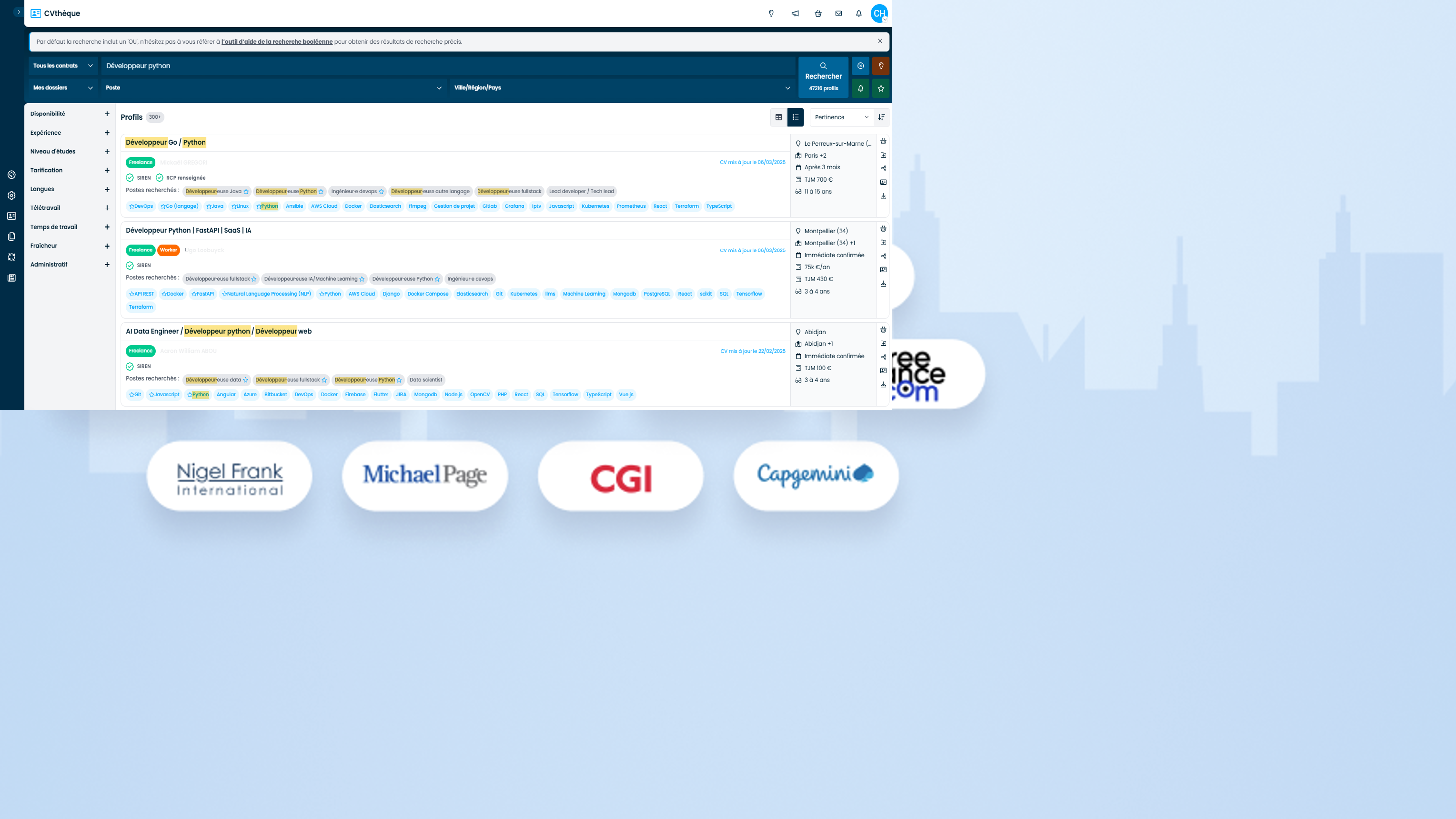 Des profils freelances et salariés, spécialisés dans les métiers du développement, de la data, du cloud, du devOps, de la cybersécurité, du produit, de la chefferie de projet etc. Tous régulièrement mis à jour. ✅ Moteur de recherche puissant avec filtres avancés & requêtes booléennes : trouvez rapidement les profils qui correspondent à vos critères les plus précis : compétences techniques, disponibilité, localisation, TJM, etc. ✅ Suggestions automatiques grâce au matching intelligent (IA) : chaque offre publiée génère une liste de profils pertinents, classés par niveau d’adéquation avec votre besoin. ✅ Profils exclusifs en avant-première pendant 24h : soyez les premiers à contacter les talents qui postulent, avant qu’ils ne soient visibles du reste du marché. ✅ Interface rapide, fluide et conçue pour les recruteurs. Navigation intuitive, tableaux de suivi clairs, actions en un clic : tout est pensé pour gagner du temps sans sacrifier la qualité. ✅ Messagerie intégrée pour contacter les profils en temps réel