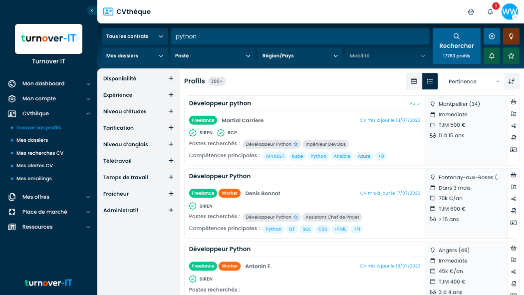 Turnover-IT met à disposition une CVthèque dédiée aux métiers de l’IT et du digital avec +120 000 profils visibles et mis à jour dans les 8 derniers mois. Grâce à un moteur de recherche performant, vous pouvez affiner vos résultats par compétences, technologies, localisation, disponibilité, TJM, et bien plus. Recherche plus orientée en langage naturel ou recherche booléenne pour des besoins plus complexes, l’algorithme natif intelligent et nos outils de filtrage avancés vous permettent d’identifier rapidement les bons profils, de façon précise et efficace.